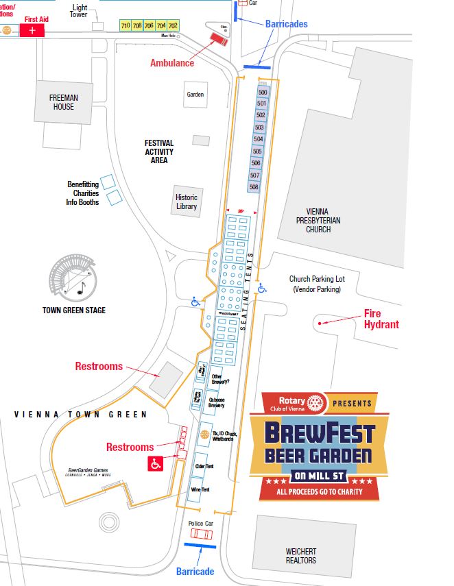 New this year, Rotary is requesting to move Backstage Brewfest from the Fire Station Parking lot to Mill Street between Vienna Presbyterian Church and the Town Green and Church Street and Maple Avenue and on the Town Green lawn between the park restrooms and the plaza next to Maple Avenue. This will allow for resource consolidation, safer venues (no one is crossing Maple Avenue), and reduced costs.